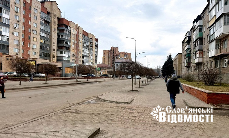Сьогодні над містом хмари. Можливо, сонце трохи розбавило б цю картину, додало б світла знайомим фасадам, але сіре небо лише сильніше підкреслює реальність, яку зафіксували журналісти “Слов’янських відомостей“. Чути лише легкий вітер, який перегортає сміття чи колише гілки дерев, і цей звук замінює той звичний міський гул. Та час від часу цю тишу прорізають зовсім не мирні звуки, які нагадують, що війна — поруч.