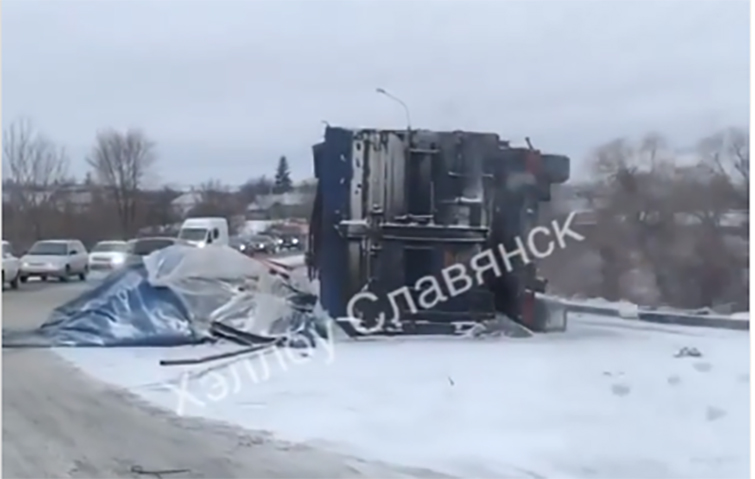 На выезде из Славянска перевернулся грузовик