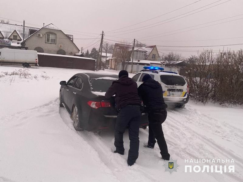 Вдень і вночі групи реагування допомагають “звільнитись” автомобілям, що через негоду застрягли під час руху. Допомогу від правоохоронців отримали мешканці смт Черкаське та міста Миколаївка.