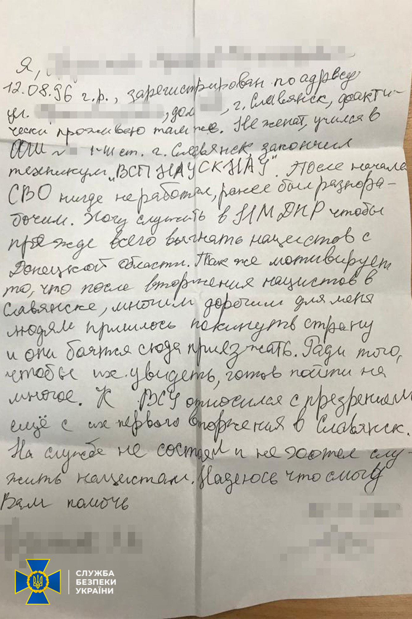 Під час обшуку за місцем проживання зловмисника правоохоронці виявили мобільний телефон, що містить докази листування із ворогом, а також чернетку заяви, в якій фігурант просив прийняти його до лав окупантів.