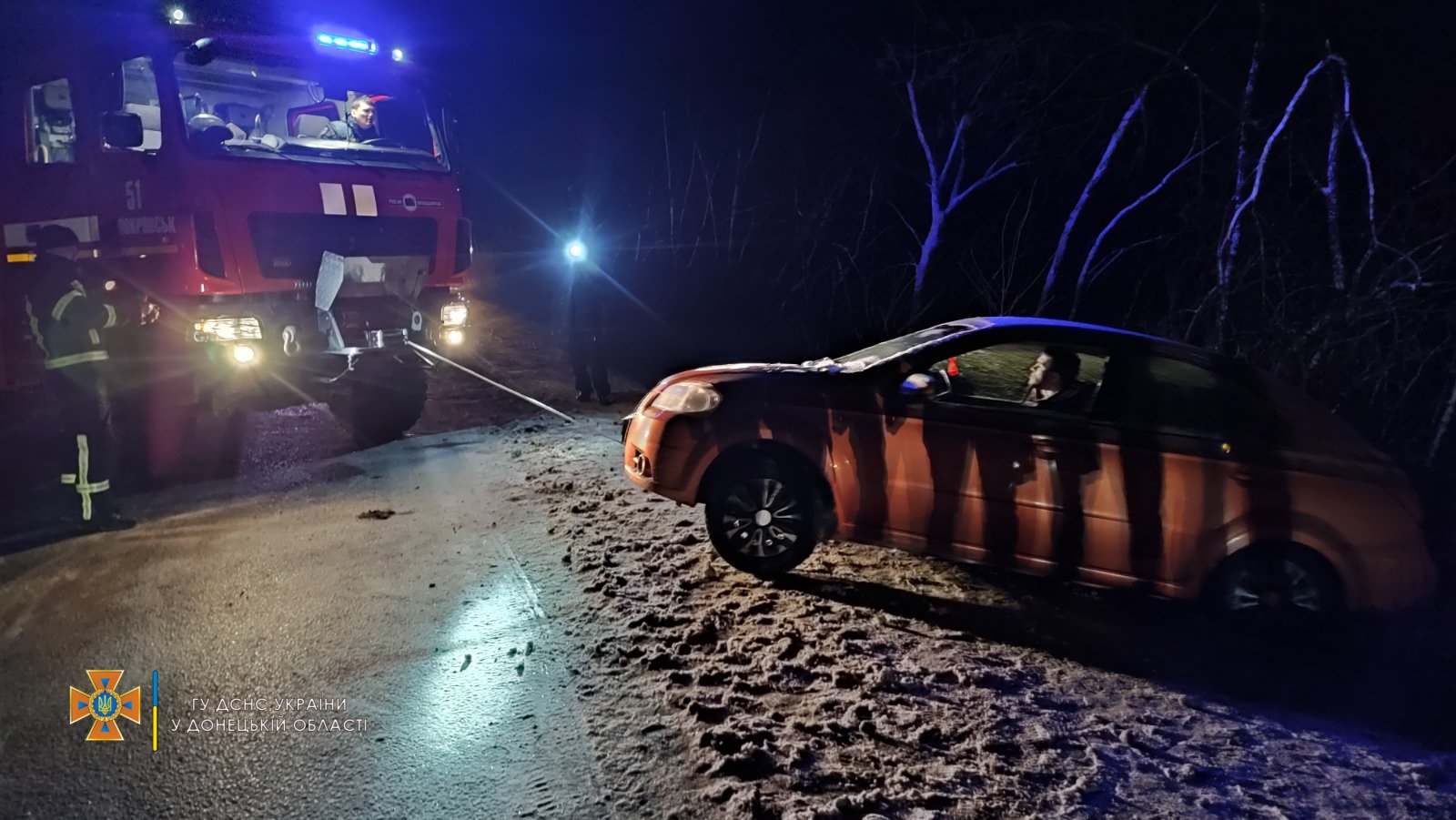 18 января в 16:51 в Главное управление поступила информация о необходимой помощи двум водителям между городом Часов Яр и поселком Калиновка автомобили которых, в результате скользкого участка дороги, не могли продолжать движение.