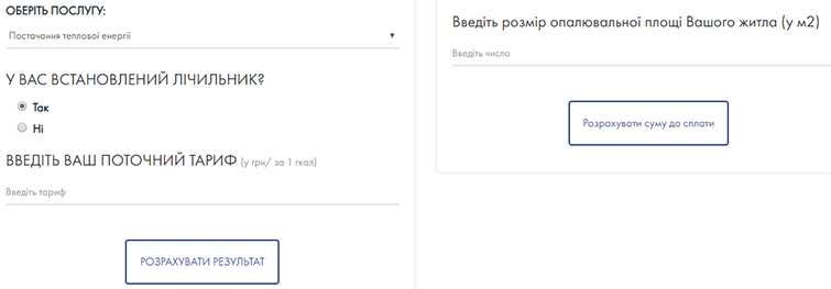 Чтобы узнать справедливый тариф на тепло, необходимо выбрать эту услугу, после чего ответить на вопрос, установлен ли счетчик, а затем ввести текущий тариф в гривнях за 1 Гкал и отапливаемую площадь жилья.