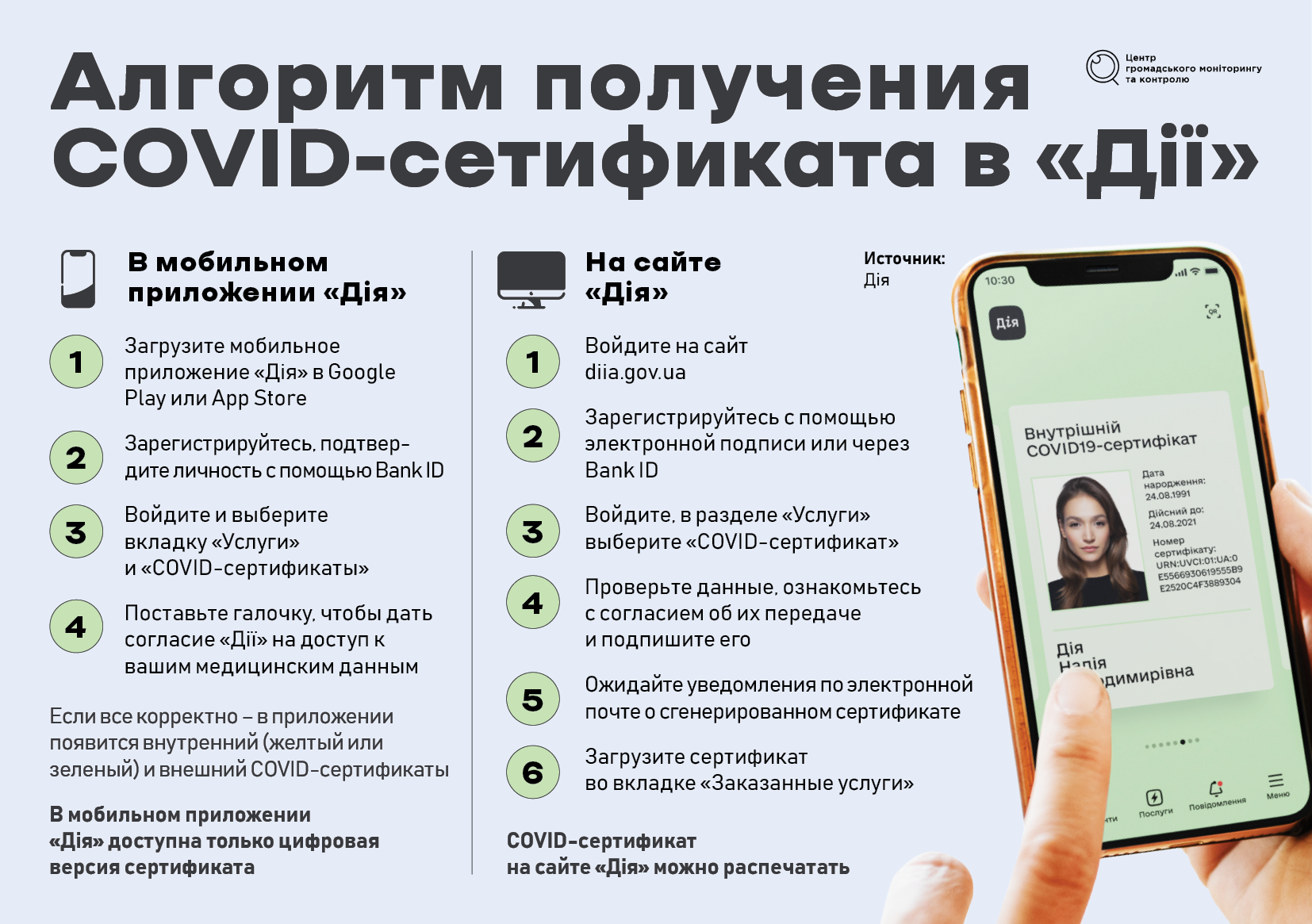 В ноябре наличие документа о вакцинации от COVID-19 стало острой необходимостью. В большинстве областей Украины пользоваться транспортом и посещать общественные учреждения можно только при наличии свидетельства или сертификата о вакцинации. Впрочем, многие не знают, как получить эти документы, или сталкиваются с трудностями. Центр общественного мониторинга и контроля рассказывает, как легко оформить свидетельство о вакцинации и COVID-сертификаты.