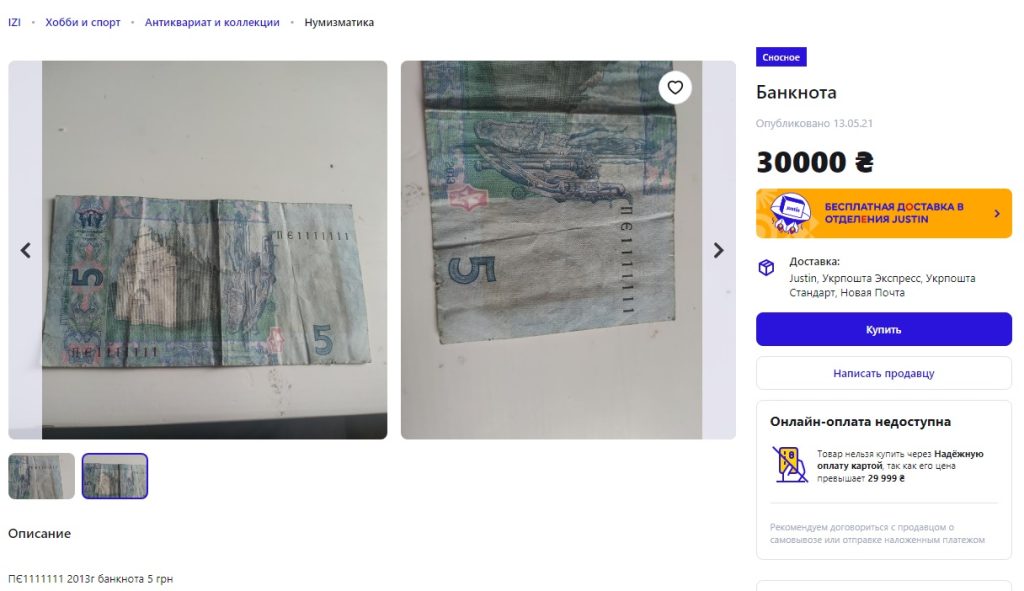 Объявление о продаже данной купюры опубликовано на сайте iZi.