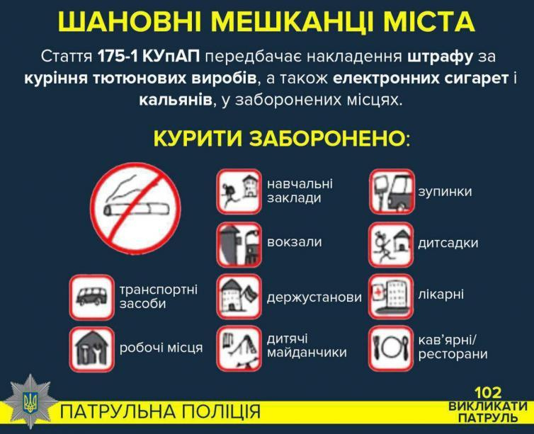 Від під’їздів, тролейбусів та ресторанів: патрульні нагадали, де заборонено куріння тютюнових виробів, електронних сигарет та кальянів