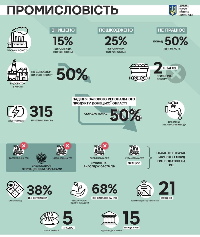 В Донецкой области уничтожено почти 15% производственных мощностей промышленности, повреждено – около 25%. В общей сложности прекратили работу более половины предприятий. Значительная часть из них на оккупированной территории (Азовсталь, комбинат Зота Некрасова), но также и на свободной (среди них Авдеевский коксохим и НКМЗ).