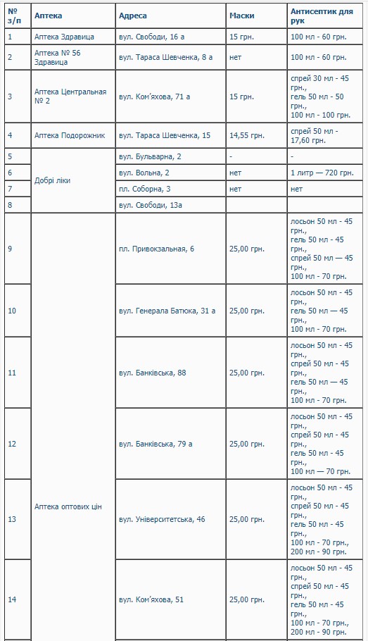 Слов’янська міська рада інформує про наявність захисних масок та антисептиків для обробки рук в аптечних закладах міста Слов’янськ станом на 13.04.2020 р.