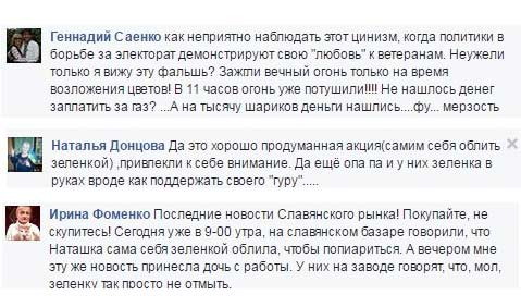 Подогрела обстановку и ситуация с обиженным ветераном Любовью Печко, на которую во время Марша мира также попала зеленка. Эту новость подхватили многие СМИ, которые написали о "издевательствах над ветеранами" в Славянске.