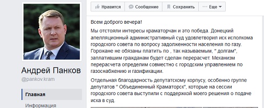 «Мы отстояли интересы краматорчан и это победа. Донецкий апелляционный административный суд удовлетворил иск исполкома городского совета по вопросу задолженности населения по газу. Горожане не обязаны платить по, так называемым, " долгам", заплатившим гражданам будет сделан перерасчет. Механизм перерасчета определим совместно с городским управлением по газоснабжению и газификации»- такое заявление сделал на своей странице в Facebook городской голова Краматорска Андрей Панков.