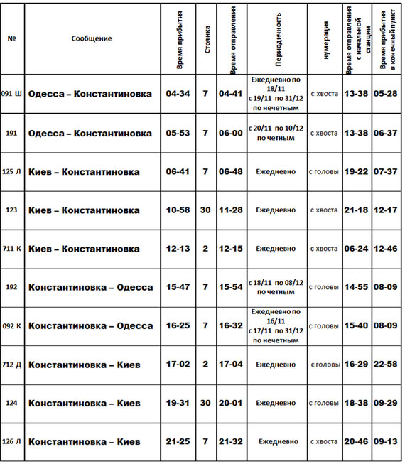 Расписание движения пассажирских поездов по ст. Славянск с изменениями и дополнениями по состоянию на 10.11.2016 года.