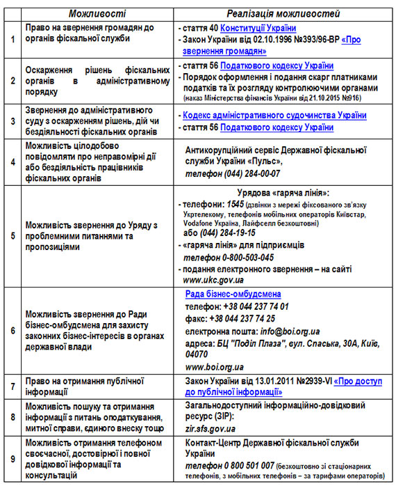 Для забезпечення своїх прав у відносинах з органами державної фіскальної служби – як громадянин і як платник податків – ти маєш наступні можливості: