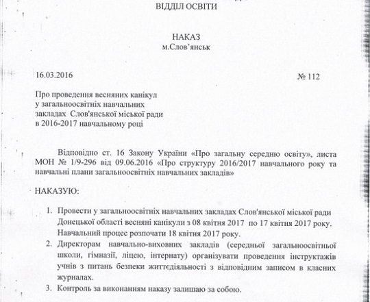 Соответствующий приказ начальника городского отдела образования Игоря Рублевского размещен на сайте slov-osvita.gov.ua