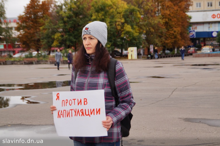 Сьогодні, 6 жовтня, у Слов’янську на Соборній площі пройшла акція «Ні капітуляції». Аналогічна акція пройшла в деяких містах України, включаючи Київ. Мета акції – протест проти домовленостей, які можуть привести до появи на території України утворень повністю підконтрольних Росії, статус яких буде закріплений законом. Крім того, люди, які прийшли,були проти відходу ВСУ у глиб території України, у рамках розведення сил.