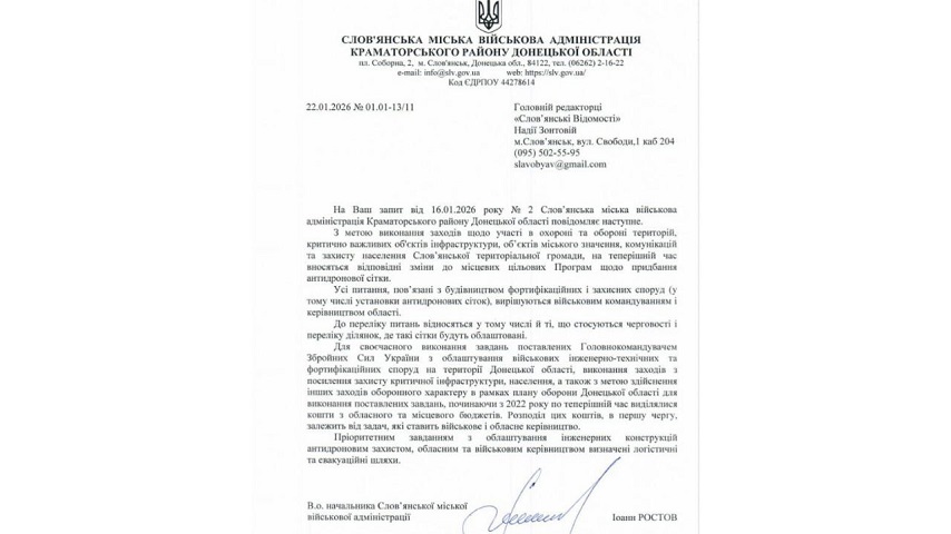 Редакція Слов’янських відомостей направляла інформаційний запит до Слов’янської міської військової адміністрації ще 16.01.2026 року та отримала відповідь.