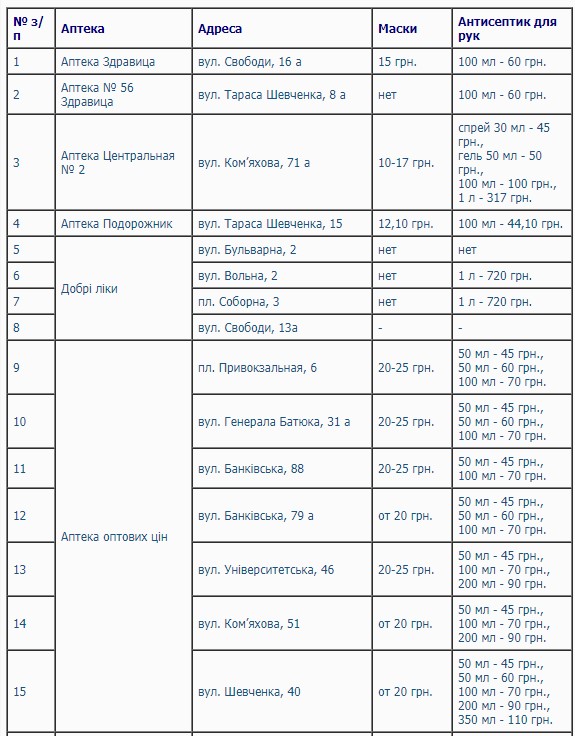 Слов’янська міська рада інформує про наявність захисних масок та антисептиків для обробки рук в аптечних закладах міста Слов’янськ станом на 22.04.2020 р.