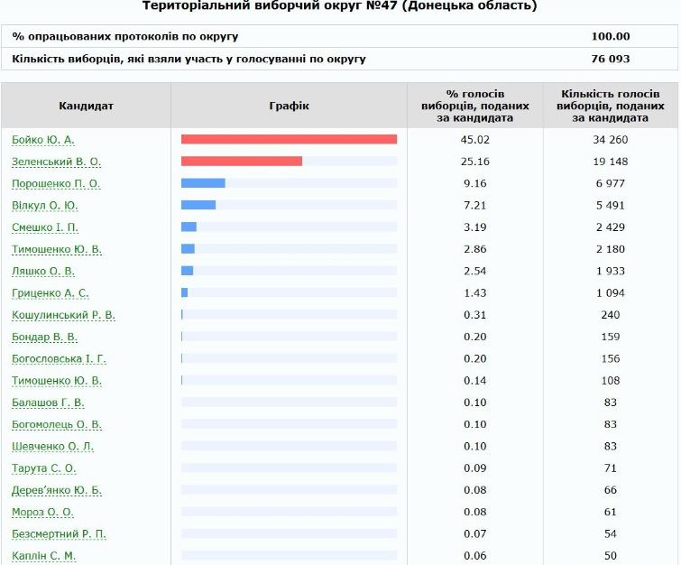 Больше всех голосов набрал Юрий Бойко – 45,02%. На втором месте Владимир Зеленский – 25,16%. Третий, Петр Порошенко, за которого проголосовали 9,16% избирателей.