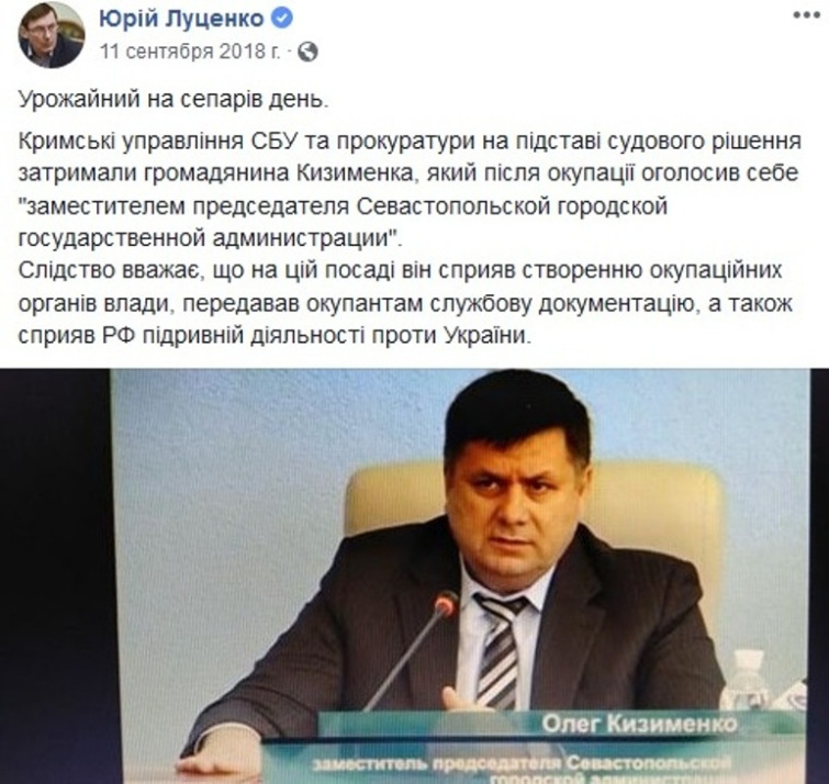 О задержании Олега Кизименко писал на своей странице в Фейсбук Генеральный прокурор Юрий Луценко.