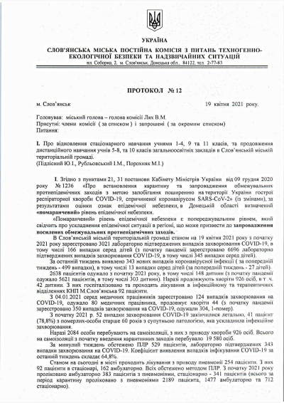 3. Начальнику отдела образования Славянского городского совета (Рублевский): – с 22.04.2021 до 30.04.2021 года (включительно) продолжить дистанционное обучение учащихся 5-8 классов в общеобразовательных учреждениях территориальной общины; – с 22.04.2021 до 30.04.2021 года (включительно) восстановить стационарное обучение учащихся 1-4 и 9 и 11 классов в общеобразовательных учреждениях территориальной общины.