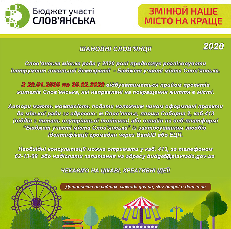 У 2020 році Слов’янська міська рада продовжує реалізовувати інструмент безпосереднього впливу мешканців міста на бюджетну політику – Бюджет участі.