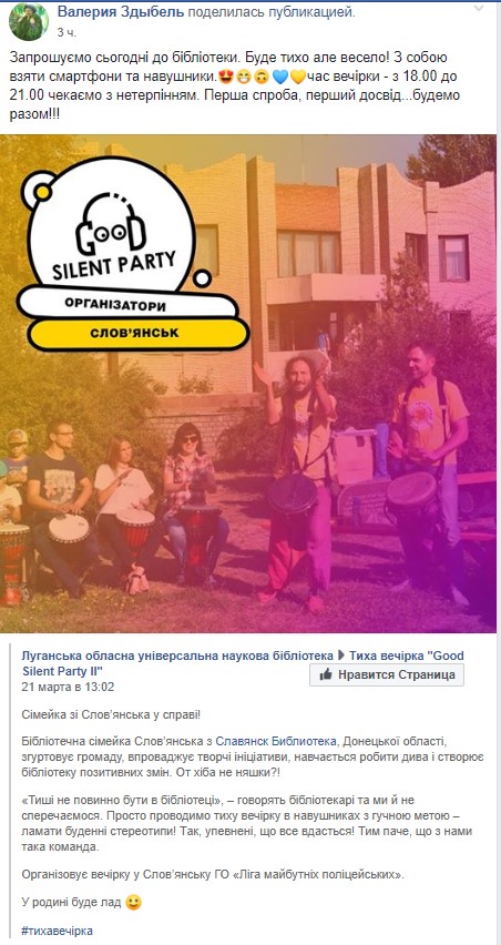 ” Запрошуємо сьогодні до бібліотеки. Буде тихо але весело! З собою взяти смартфони та навушники. Час вечірки – з 18.00 до 21.00 чекаємо з нетерпінням. Перша спроба, перший досвід…будемо разом!!!“, – пише у Фейсбук Валерія Здибель, фахівець Центральної бібліотеки Слов’янська.