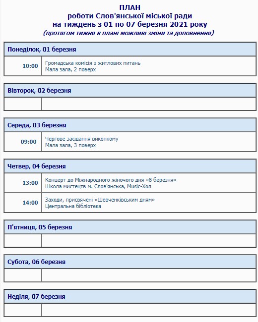 План на текущую неделю опубликован на официальном сайте Славянского городского совета.