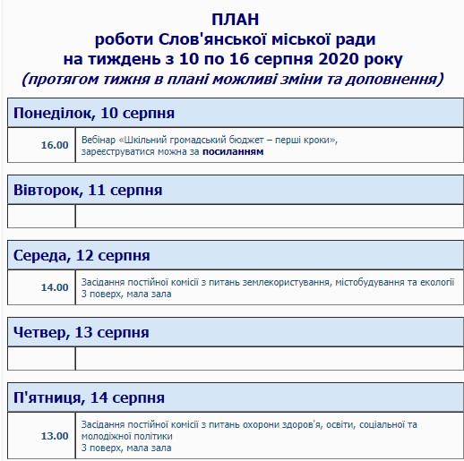 План на текущую неделю опубликован на официальном сайте Славянского городского совета.