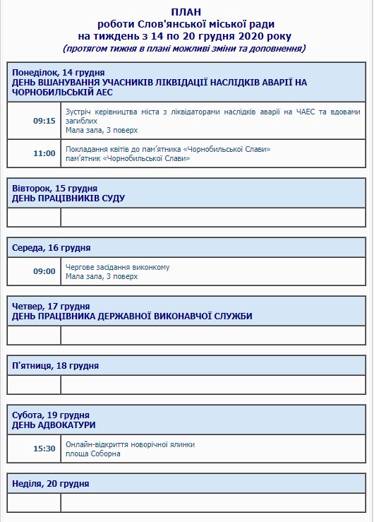План на текущую неделю опубликован на официальном сайте Славянского городского совета.