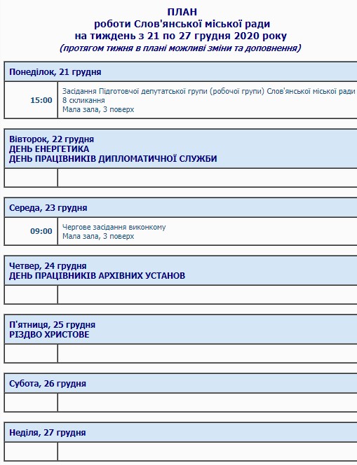 План на текущую неделю опубликован на официальном сайте Славянского городского совета.