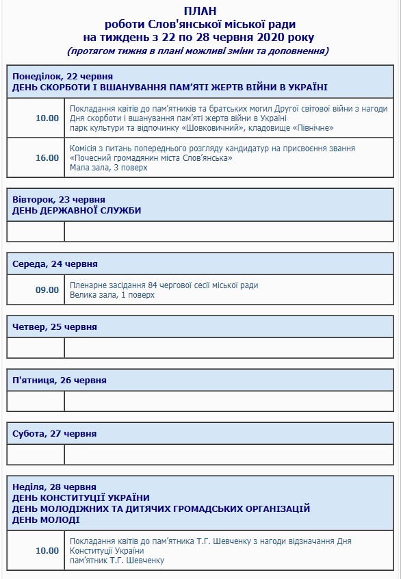 Как передает slavinfo.dn.ua, план на текущую неделю опубликован на официальном сайте Славянского городского совета.