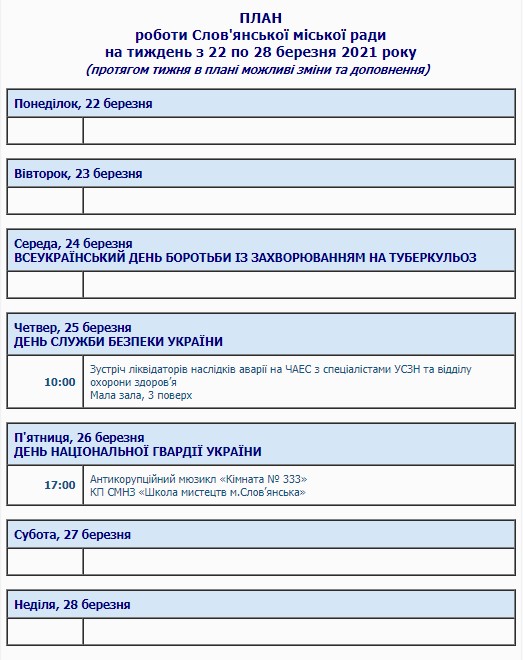 План на текущую неделю опубликован на официальном сайте Славянского городского совета.