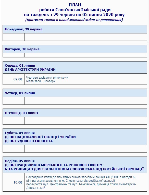 Как передает slavinfo.dn.ua, план на текущую неделю опубликован на официальном сайте Славянского городского совета.