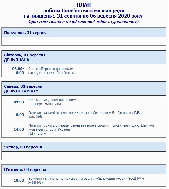 План на текущую неделю опубликован на официальном сайте Славянского городского совета.
