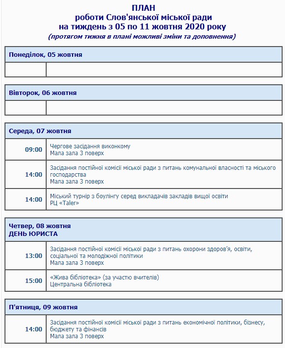 План на текущую неделю опубликован на официальном сайте Славянского городского совета.