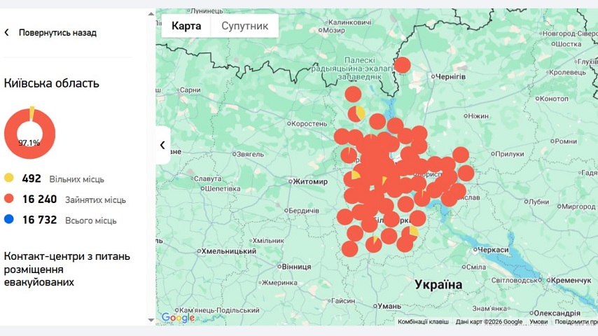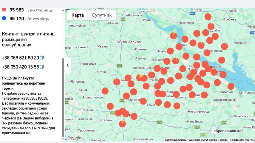 Отримати попередню інформацію про можливості розміщення допомагає державний проєкт “Там, де вас чекають“. Зокрема на інтерактивній мапі можна побачити кількість доступних місць для тимчасового проживання у різних областях України. Там же розміщені й контакти регіональних центрів, які координують розселення евакуйованих людей, хоча ця опція доступна не в усіх областях. Наприклад у Черкаській області доступні два номери, а у Київській — жодного. Можливо, це пов’язано з малою кількістю вільних місць і варто розглянути інші варіанти.