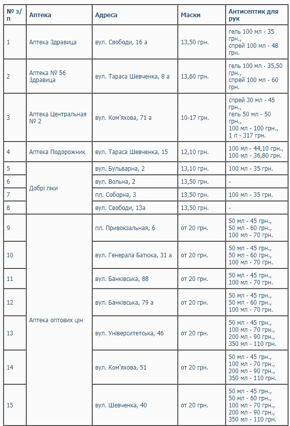 Слов’янська міська рада інформує про наявність захисних масок та антисептиків для обробки рук в аптечних закладах міста Слов’янськ станом на 27.04.2020 р.