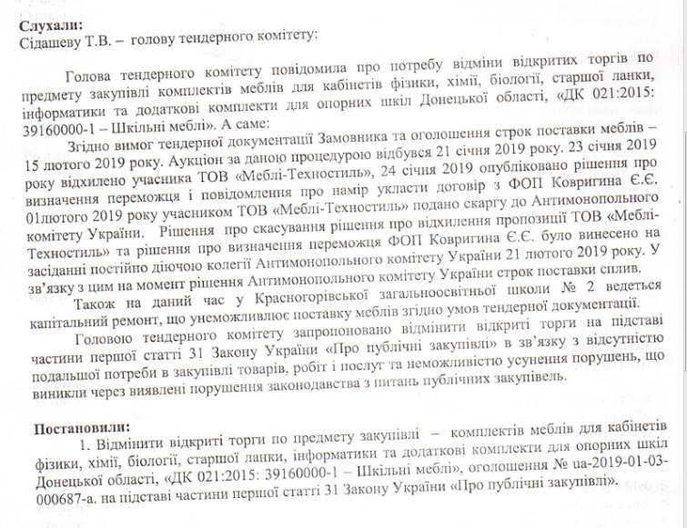 Соответствующий документ опубликован на сайте «Прозоро». Тендерный комитет Департамента образования и науки Донецкой области отменил торги на основании того, что нет необходимости больше покупать мебель и невозможно исправить нарушения закона, которые возникли при проведении торгов.