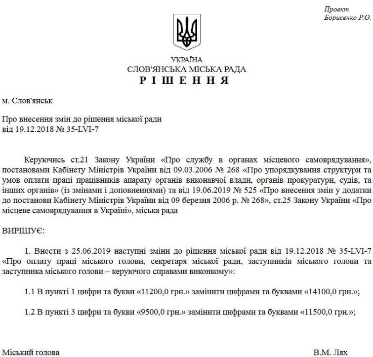 Депутати, вчора 25 липня проголосували за підняття заробітної плати міському голові, його заступникам та секретарю міської ради. Оклад Вадима Ляха збільшився з 11 200 до 14 100 грн. Оклад його заступників та секретаря міської ради збільшився з 9 500 до 11 500 грн.