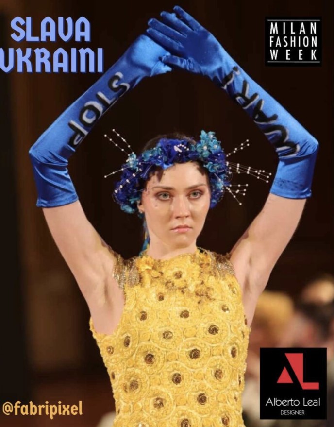 Дар’я Шахова стала символом патріотизму, відкривши показ у Мілані в образі Слава Україні. Джерело: instagram.com/alealfashion