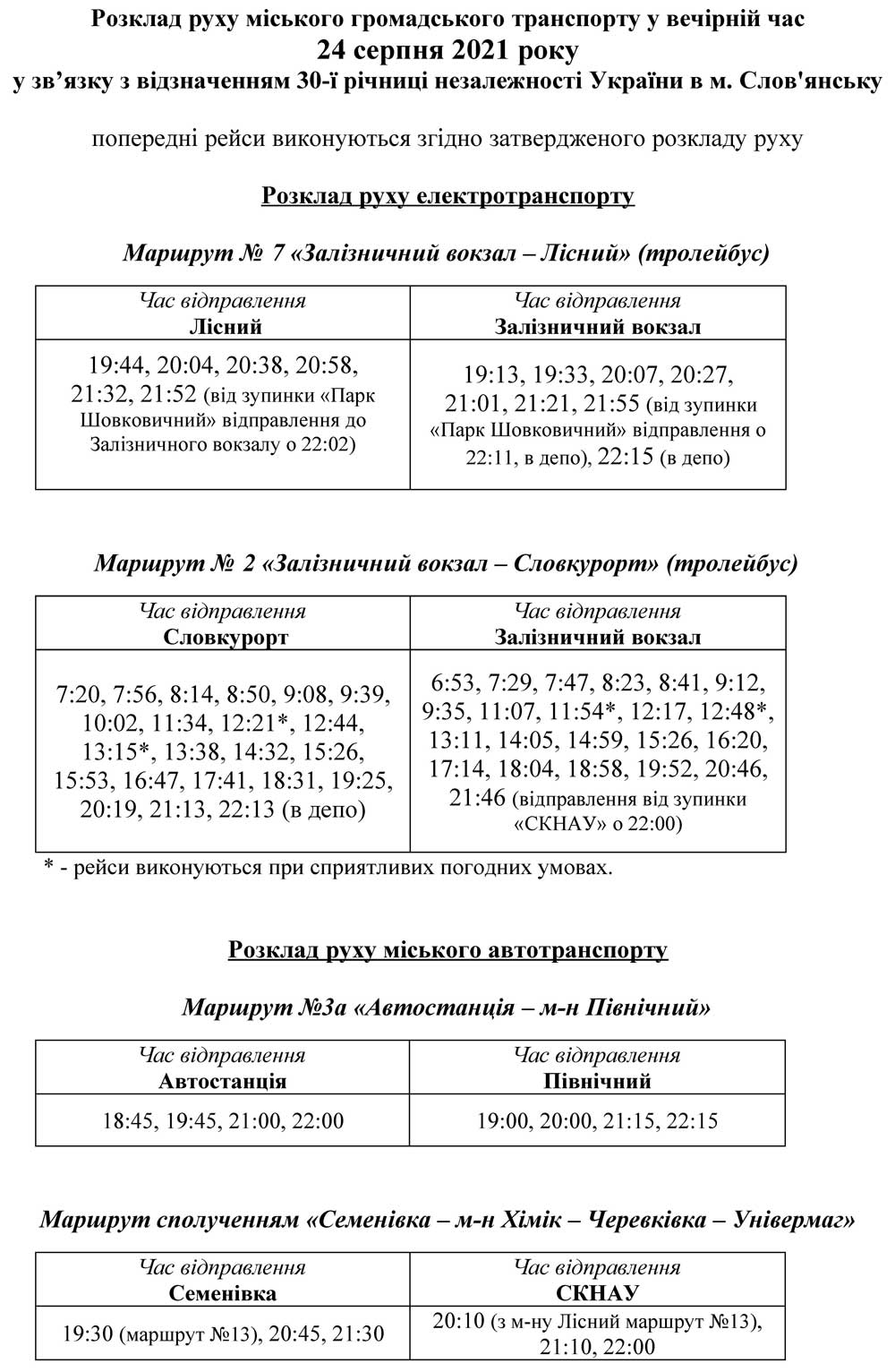 У рамках святкування 30-ї річниці незалежності України організовано роботу додаткових рейсів міського громадського транспорту у вечірній час 24 серпня. Пропонуємо детальний розклад.
