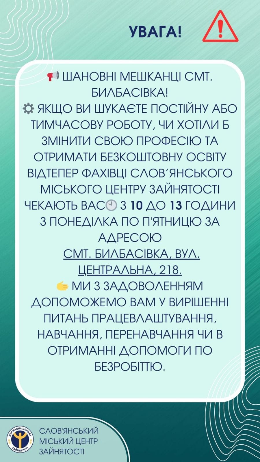 Фахівці Слов’янського центру зайнятості вестимуть прийом у Билбасівці
