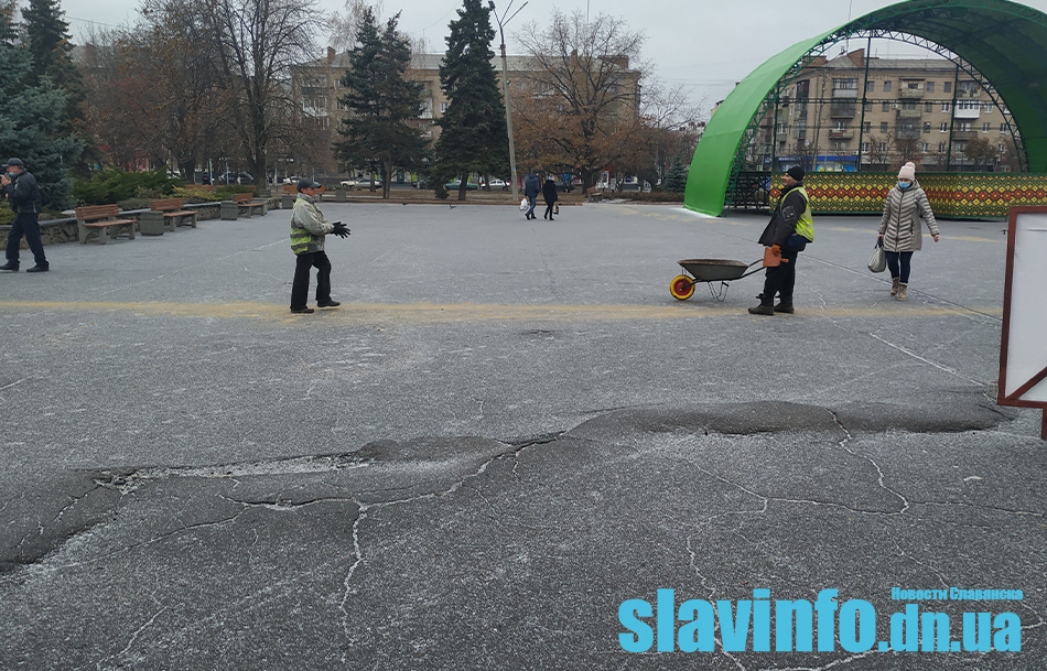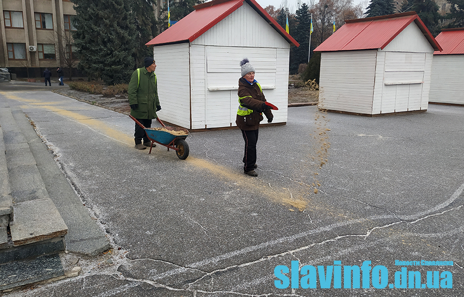 Утренний снег в Славянске стал причиной гололеда на тротуарах и дорогах города. Оперативно решать эту проблему коммунальные службы начали с центральной площади города. Спустя пару часов после осадков по крайней мере четыре пары работников КП «Благоустройство» начали посыпать песком центральную площадь.