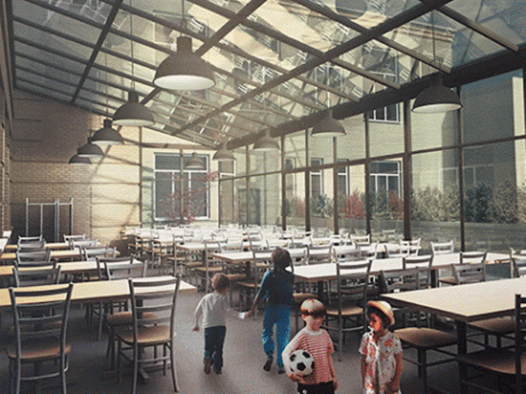 Выход нашли неожиданно. О проблеме узнал французский архитектор и в качестве подарка городу нарисовал эскиз. Это оказалось интересное решение. Оно предполагало тепломодернизацию всего одной северной стены, по которой идет трещина. К ней же пристраивается модульный пищеблок.