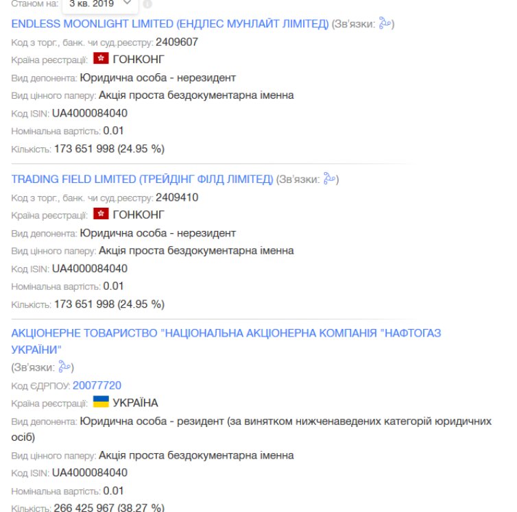 По даним за третій квартал 2019 року, кінцевий бенефіціар відсутній. Серед акціонерів зазначені дві компанії з Гонконгу: ENDLESS MOONLIGHT LIMITED та TRADING FIELD LIMITED. Обидві компанії, які скоріш за все є офшорними, мають по 24,5% акцій ПАТ «Донецькоблгаз». НАК «Нафтогаз України» має 38, 27% акцій.