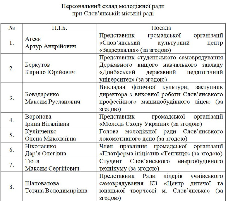 В Славянске планируется создать молодежный совет. На сегодняшний день на участие в этом консультативно-совещательном органе при городском совете подано 8 заявок. Эту информацию озвучил на совместном заседании депутатских комиссий начальник отдела по делам семьи, молодежи и спорта Александр Мищенко. В проекте решения о создании молодежного совета есть персональный состав. Окончательное решение о создании этого молодежного объединения при городской власти депутаты будут принимать на сессии городского совета 12 июля.