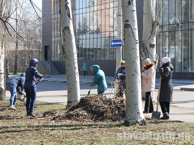 Сегодня, 29 марта, сотрудники Славянского городского совета вышли на уборку сквера, который находится за зданием горсовета. Вооружившись метлами, граблями и лопатами, чиновники метут аллейки и тротуары, выгребают мусор и листву.