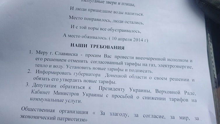 • Мэру г. Славянска – просим Вас провести внеочередной исполком и его решением отменить согласованный тарифы на газ, электроэнергие, тепло и воду. Установить новые тарифы и подписать.