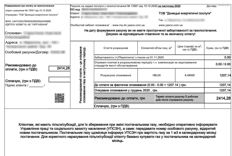 В декабре жители региона, которые заключили договор на поставку газа с YASNO (ООО «Донецкие энергетические услуги»), получат в почтовые ящики первые платежки. Рассчитаться за потребленный в ноябре газ согласно Правилам следует до 25 декабря. В счетах от YASNO указаны сумма к оплате, тариф, по которому произведено начисление, количество потребленных кубометров топлива и др. Поставщик подготовил детальное разъяснение, на что стоит обратить внимание в платежке за газ.