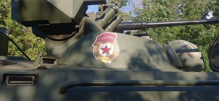 Те, що це саме БТР з парадного розрахунку, вказує гвардійський знак на башті цієї бронетехніки.