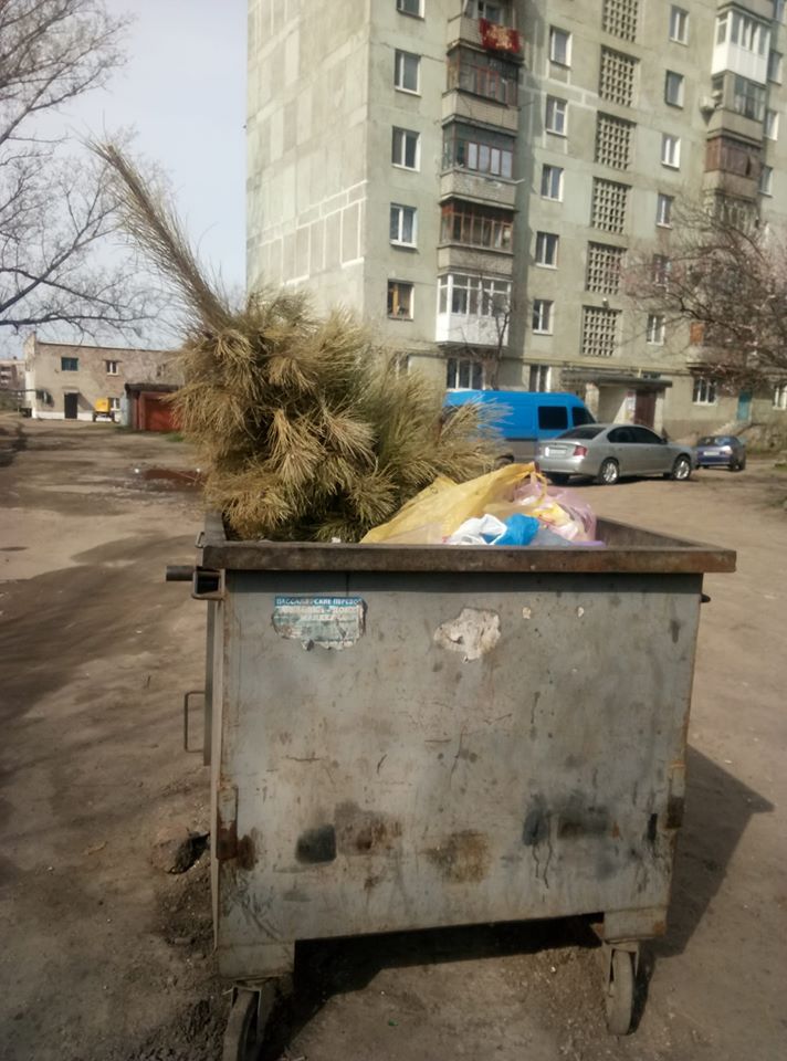 Фото новорічної ялинки в в контейнері для сміття на своїй сторінці в Фейсбук опублікував Сергій Горбатенко.