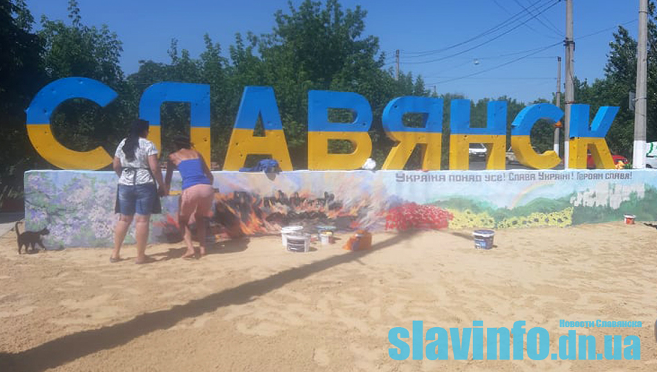 На постаменте, на котором расположены желто-голубые буквы, поврежденные осколками, нарисовали мурал. Также обновили лозунг ” Україна понад усе! Слава Україні! Героям слава!”.